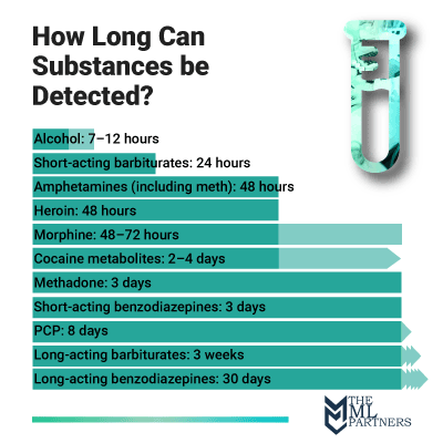 The amount of time that a urine drug test can detect drugs in your system depends on the substance and quantity used. Different drugs have different metabolites that can remain in your body for different periods of time. For example, marijuana can be detected in urine for up to 30 days after use, while cocaine is typically only detectable for a few days. The more drugs that are used, the longer they will remain detectable in your urine. See our graphic on timelines for general detection guidelines.